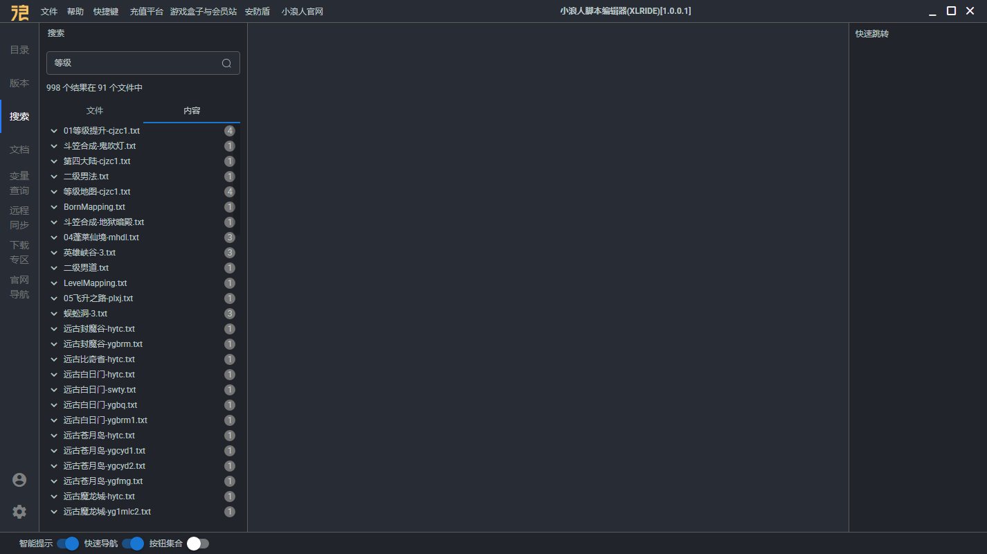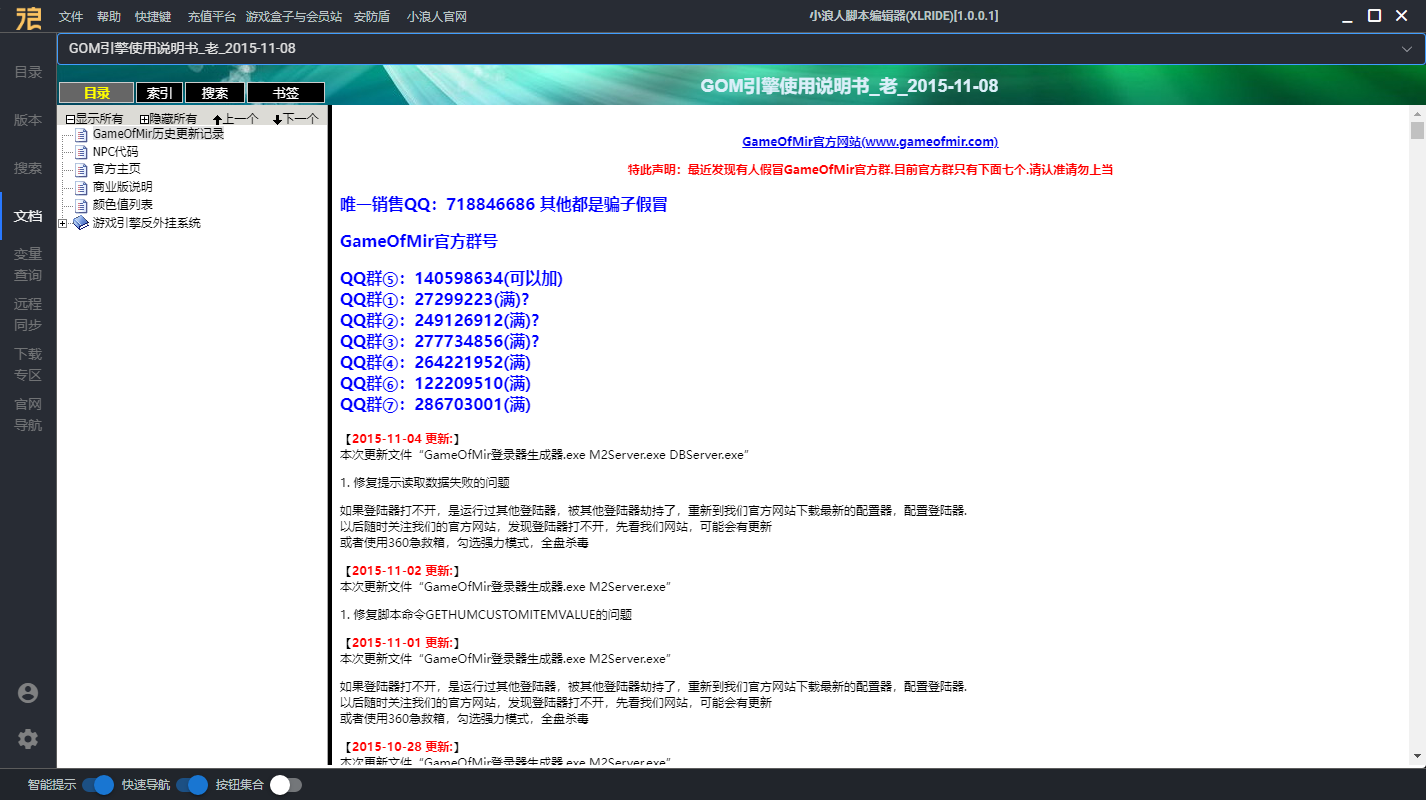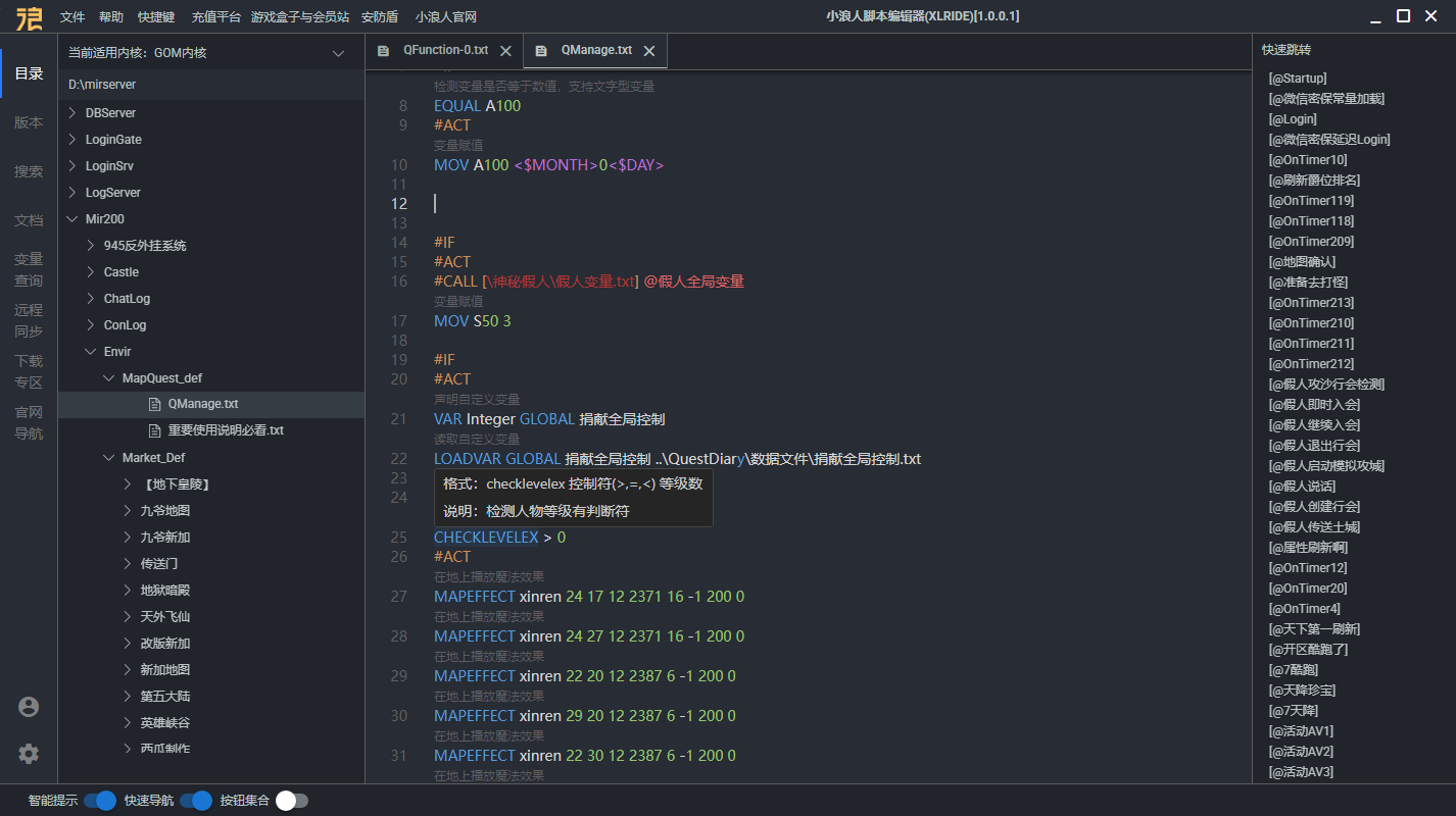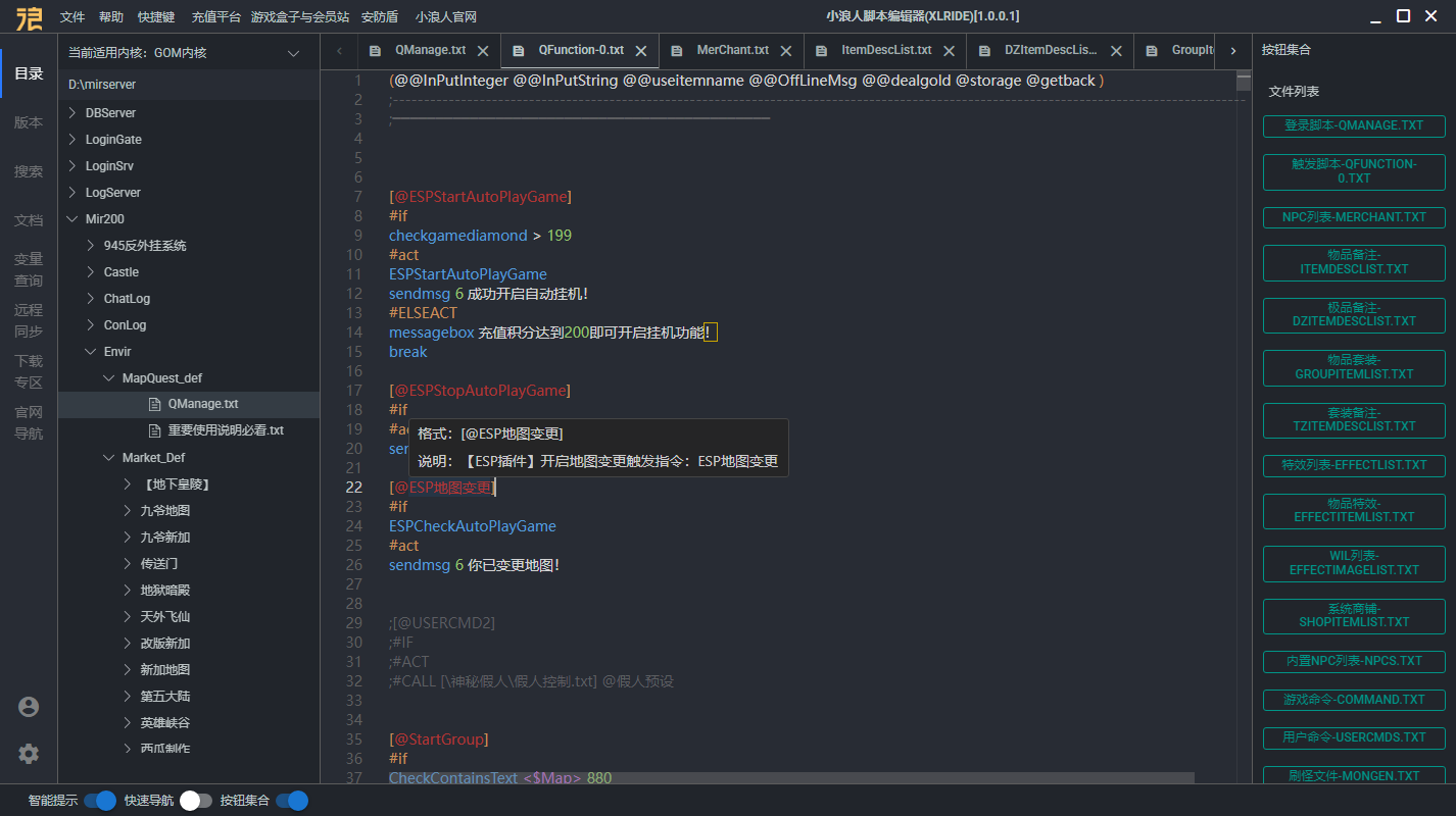 致力于成为小浪人开区助手,会员站,游戏盒子等产品之后,又一力作--完美的传奇游戏智能脚本编辑器,以智能生产力,安全便捷为核心,无缝融入你的游戏脚本编辑工作,能达到【识别】【提示】【便利】【辅佐】等高质量、高效率完成每一次的脚本编辑任务!